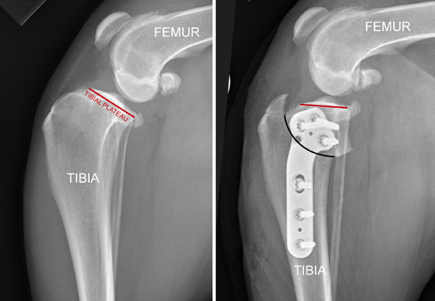 The image to the far left shows a normal dog knee and the tibial plateau, which is typically sloped down-hill and backwards at about 30 degrees. In that dog the cranial cruciate ligament is intact and so the femur remains perched on top of the tibia. However, the mechanical impetus is for the femur to slide off the back of the tibia (think of a ball on a hill) and this is what happens if the cranial cruciate ligament is ruptured, as in the second radiograph.