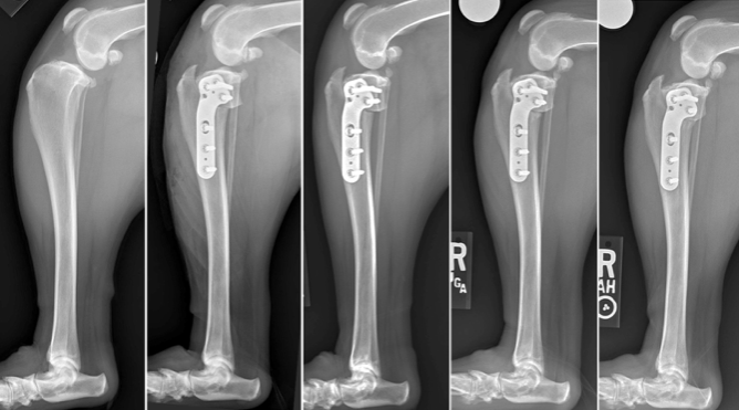 Figure. Dog TPLO surgery recovery week-by week. The images above show a patient immediately prior to surgery, immediately following surgery, and then at 4, 7, and 10 weeks following surgery. What we can see is that where the bone was cut was still visible at 4 and 7 weeks following TPLO surgery but that this had filled in with new bone (ie was healed), at 10 weeks following surgery.
