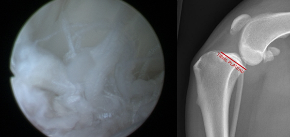 The image to the left is an arthroscopic image looking at a dog’s ruptured (torn) cranial cruciate ligament. It looks like the ends of a mop. On the right we can see that the femur is sliding off the back of the tibia, which is why procedures like TPLO surgery (aka “dog ACL surgery”) are necessary to stabilize the knee after a CCL rupture.