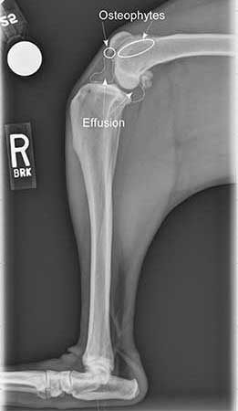 Radiographs (X-rays) provide additional information that can be helpful. It allows the veterinarian to see effusion (fluid) in the dog’s knee and bone spurs (osteophytes) around the knee, both of which indicate there is a problem in the knee. In some cases, one can also see that the femur (thigh bone) has slid backward on top of the tibia (shin bone), which does indicate CCL rupture. However, in cases of “partial CCL rupture,” there are times when both the physical exam and the radiographs are subtly abnormal. Since the CCL cannot be seen on an X-ray, the diagnosis is considered presumptive, or tentative, at this point.