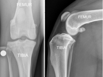 The radiographs to the right show the front view of a dog knee. The radigoraphs on the right, show a dog’s knee anatomy from the side view. The dog’s femur (thigh bone) is on top of the tibia (shin bone).