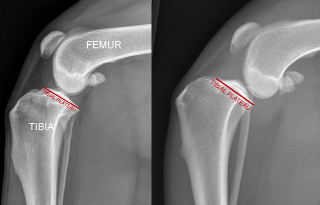 The image to the far left shows a normal dog knee and the tibial plateau, which is typically sloped down-hill and backwards at about 30 degrees. In that dog the cranial cruciate ligament is intact and so the femur remains perched on top of the tibia. However, the mechanical impetus is for the femur to slide off the back of the tibia (think of a ball on a hill) and this is what happens if the cranial cruciate ligament is ruptured, as in the second radiograph.